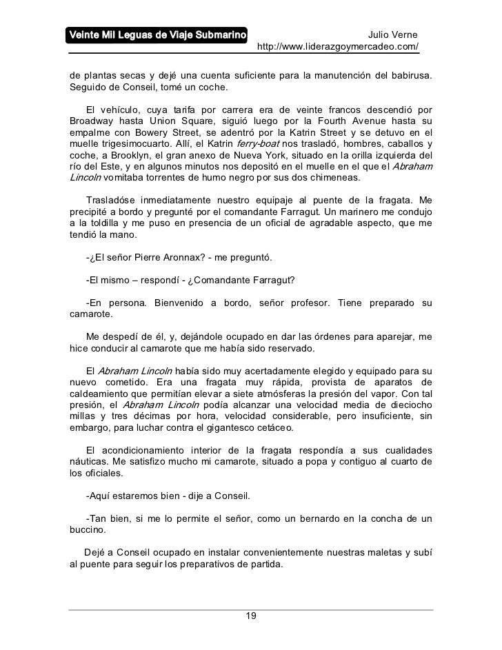 En 1869 julio verne publico veinte mil leguas de viaje submarino esta apasionante historia que nos introduce en un mar de ciencia ficcion inigualable. Indice veinte mil leguas de viaje submarino 4 primera parte 5 1. Veinte mil leguas de viaje submarino es una obra narrada en primera persona por el profesor frances pierre aronnax notable biologo que es hecho prisionero por el capitan nemo y es conducido por los oceanos a bordo del submarino nautilus en compania de su criado conseil y del arponero canadiense ned land.